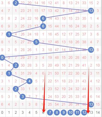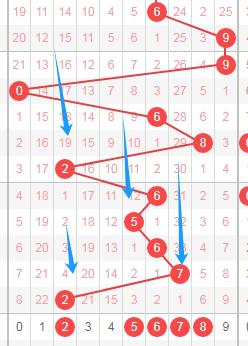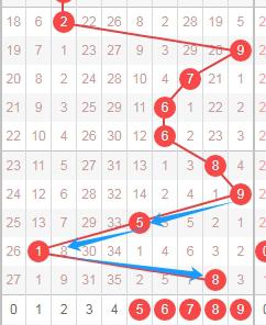 上图是体彩七星彩从左到右定位第一位数字走势图,我在上面走势图中标注出来的蓝色箭头表示遗漏周期,上面数字7遗漏周期是33期,那么本期可以关注出遗漏周期小的数字25678,个人最看好567。