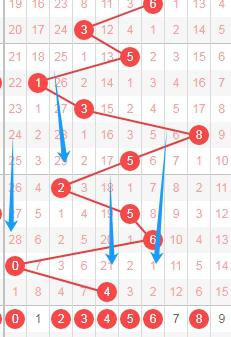 上图是体彩七星彩从左到右定位第五位数字走势图,我在上面走势图中标注出来的蓝色箭头表示开出数字的遗漏周期,上期开出数字4遗漏周期是21期,上上期开出数字0遗漏周期是28期,根据这个遗漏周期分析的话,本期可以关注遗漏周期小的数字0234568,个人最看好数字0256。