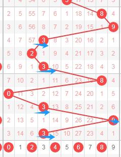 上图是体彩七星彩从左到右定位第六位数字走势图,我在上面走势图中标注出来的蓝色箭头表示开出数字的遗漏周期,上期开出数字8遗漏周期是10期,上上期开出数字2遗漏周期是23期,根据这个遗漏周期分析的话,本期可以关注遗漏周期小的数字234678,个人最看好数字246。