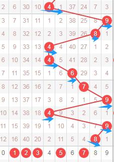 上图是体彩七星彩从左到右定位第四位数字走势图,我标注出来的蓝色大箭头表示遗漏周期,根据这些遗漏周期来分析的话,本期第四位数字可以关注出遗漏周期小的数字0134589,个人最看好数字3589。