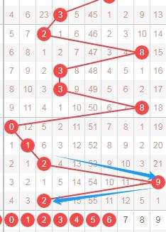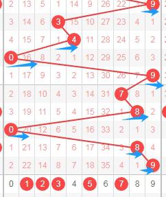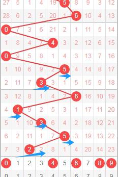 上图是体彩七星彩从左到右定位第六位数字走势图,我标注出来的蓝色大箭头表示走势跨度,最近两期开出的跨度都是大跨度,那么本期可以关注出小跨度的数字,那么就是数字0123456,个人最看好数字0356。