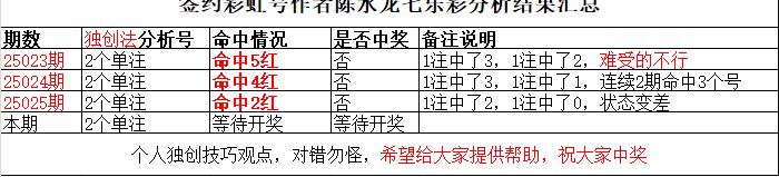 大家好我是彩虹号得签约作者陈水龙,首先咱们看我做的表格,表格内容为往期分析结果汇总(有期数限制,轮播覆盖形式)与本期分析说明,方便大家一目了然的认识我。