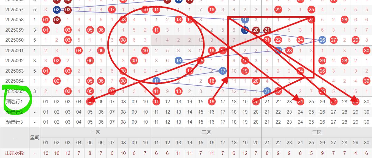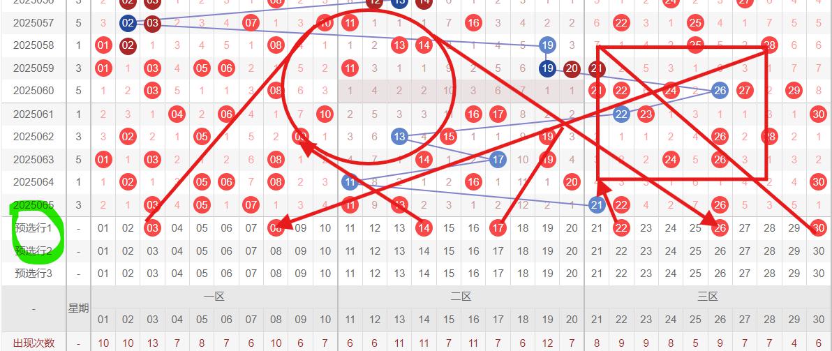跨区联动策略:绿豆们观察到"中段区间(14-22)"是黄金地带。14作为温号(近30期8次),既避过热号风险,又与高频的19(9次)、22形成三角联动。绿豆团队发现19-22组合在2025年6月多次同现(如2025065期26+21),这种区域凝聚力值得跟随。