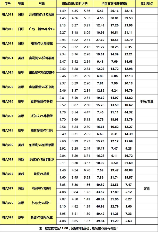 周六回归传统联赛组合,下午日系和韩职15场早间档赛事,晚间五大联赛继续激战,今晚德甲上演沙尔克vs拜仁的焦点对决,另两支德甲欧冠队伍多特和霍村也将狭路相逢;英超方面曼城和利物浦对手较弱,曼联和热刺面临新考验;另外意甲国米,以及西甲马竞也都将做客面对强敌。周六竞彩共计开售115场,早间档精选分享日职和五大联赛15场指数,另附德甲和英超2场早场解读!周六临场4档更新,下午分享两档日韩赛事,晚间分享上下半夜欧洲联赛指数,深夜加送美洲联赛方案,欢迎搜索关注“竞足离散”专家号获取!
