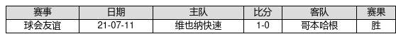 维也纳快速 VS 哥本哈根两队近10年的交战次数为1场,维也纳快速1胜0平0负,赢球概率为100.0%,平局概率为0.0%,输球概率为0.0%。