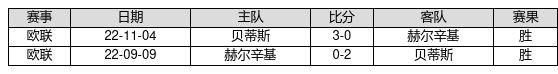 贝蒂斯 VS 赫尔辛基两队近10年的交战次数为2场,贝蒂斯2胜0平0负,赢球概率为100.0%,平局概率为0.0%,输球概率为0.0%。