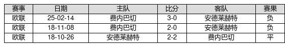 安德莱赫特 VS 费内巴切两队近10年的交战次数为3场,安德莱赫特0胜1平2负,赢球概率为0.0%,平局概率为33.3%,输球概率为66.7%。
