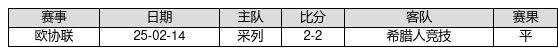 希腊人竞技 VS 采列两队近10年的交战次数为1场,希腊人竞技0胜1平0负,赢球概率为0.0%,平局概率为100.0%,输球概率为0.0%。
