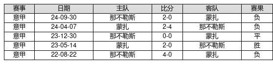 蒙扎 VS 那不勒斯两队近10年的交战次数为5场,蒙扎1胜1平3负,赢球概率为20.0%,平局概率为20.0%,输球概率为60.0%。