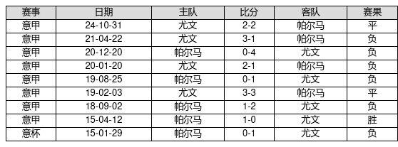 帕尔马 VS 尤文两队近10年的交战次数为9场,帕尔马1胜2平6负,赢球概率为11.1%,平局概率为22.2%,输球概率为66.7%。