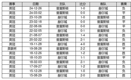 赫尔城 VS 普雷斯顿两队近10年的交战次数为16场,赫尔城5胜5平6负,赢球概率为31.2%,平局概率为31.2%,输球概率为37.5%。