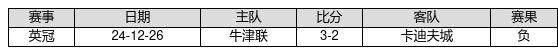 卡迪夫城 VS 牛津联两队近10年的交战次数为1场,卡迪夫城0胜0平1负,赢球概率为0.0%,平局概率为0.0%,输球概率为100.0%。