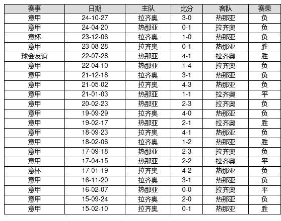 热那亚 VS 拉齐奥两队近10年的交战次数为21场,热那亚5胜3平13负,赢球概率为23.8%,平局概率为14.3%,输球概率为61.9%。
