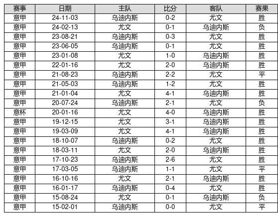 尤文 VS 乌迪内斯两队近10年的交战次数为21场,尤文15胜3平3负,赢球概率为71.4%,平局概率为14.3%,输球概率为14.3%。