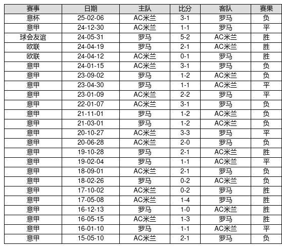 罗马 VS AC米兰两队近10年的交战次数为24场,罗马8胜6平10负,赢球概率为33.3%,平局概率为25.0%,输球概率为41.7%。