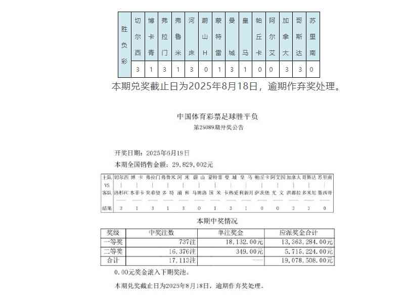 北京时间6月19日,胜负彩第25089期开奖结果揭晓。14场1等737注18,132元,14场2等16,376注349元。任九31,452注256元。本期胜负彩销量为29,829,002元,任九投注总额为12,594,276元。