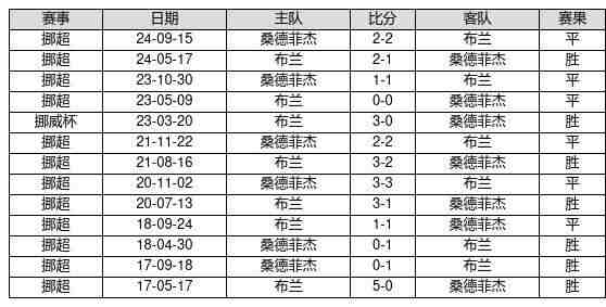 布兰 VS 桑德菲杰两队近10年的交战次数为13场,布兰7胜6平0负,赢球概率为53.8%,平局概率为46.2%,输球概率为0.0%。