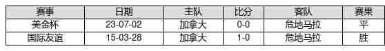 加拿大 VS 危地马拉两队近10年的交战次数为2场,加拿大1胜1平0负,赢球概率为50.0%,平局概率为50.0%,输球概率为0.0%。
