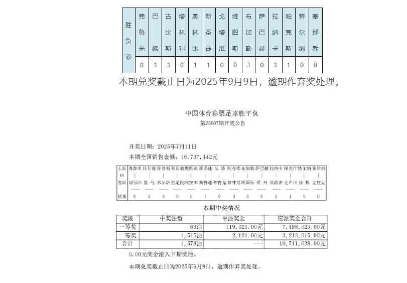 北京时间7月11日,胜负彩第25097期开奖结果揭晓。本期头奖开出63注,单注奖金119,021元;二等奖开出1,515注,单注奖金2,121元;任九开出8,746注919元。本期胜负彩销量为16,737,442元,任九投注总额为12,570,674元。