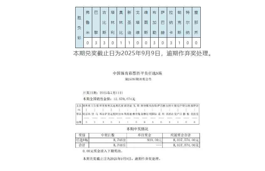 北京时间7月11日,胜负彩第25097期任九开奖结果揭晓。本期任九开出8,746注,单注奖金919元,本期任九投注总额为12,570,674元。