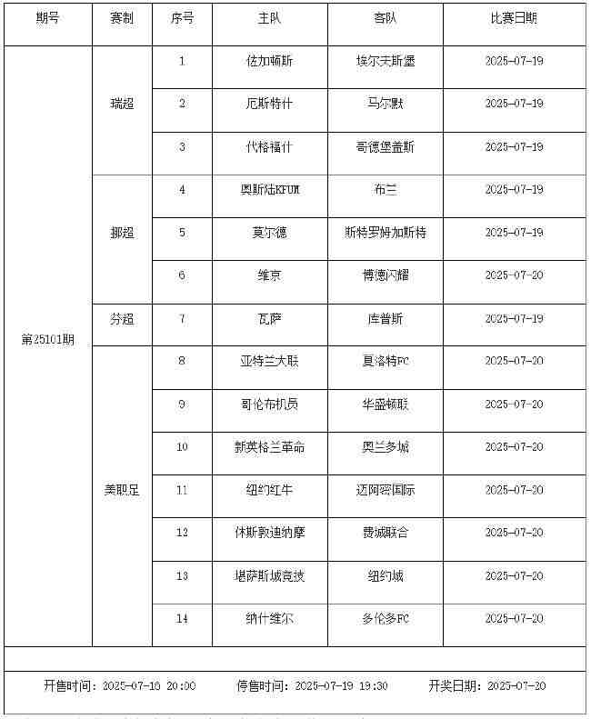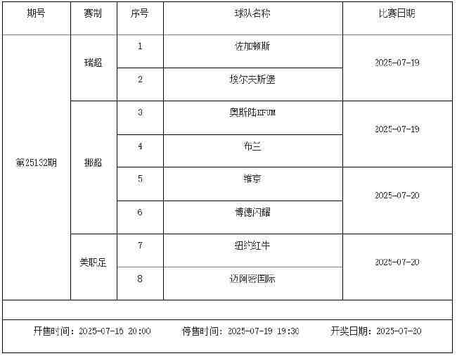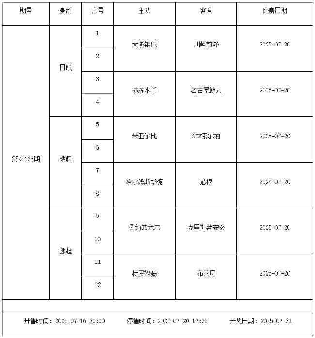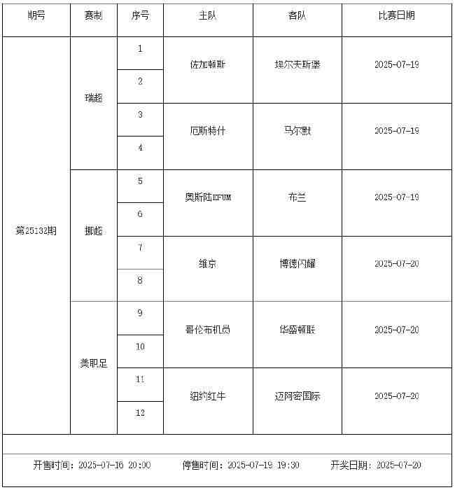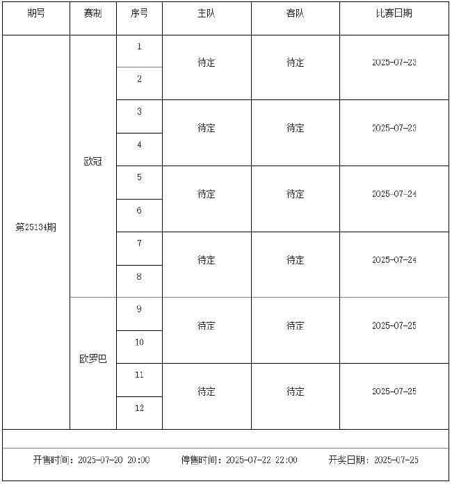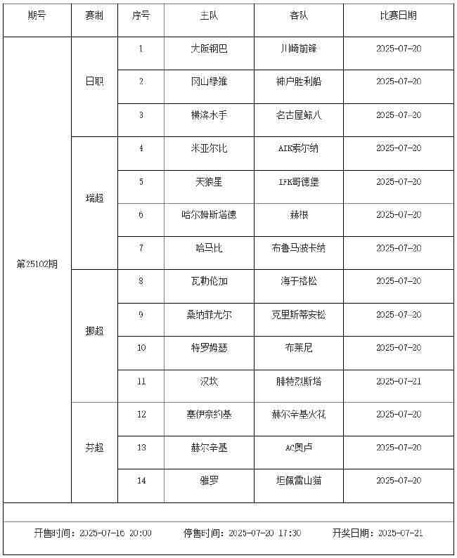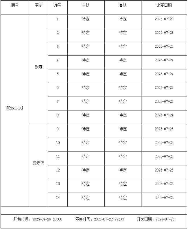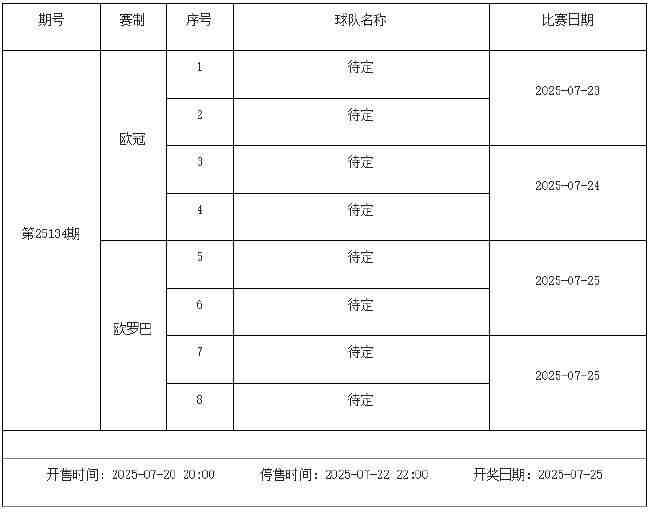 我中心制定了2025年中国足球彩票胜负游戏(14场、任选9场)、6场半全场胜负游戏和4场进球游戏7月18日-7月24日的竞猜场次安排(具体附后),其竞猜对象、开售时间、停售时间和计奖时间均以本文为准。