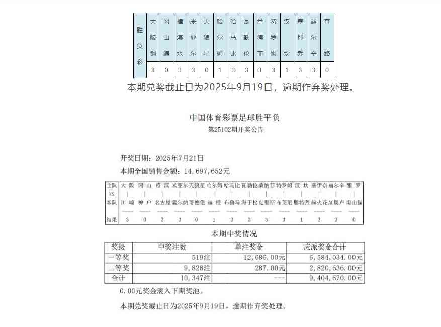北京时间7月21日,胜负彩第25102期开奖结果揭晓。本期足彩头奖开出519注,单注奖金12,686元;二等奖开出9828注287元;任九开52,760注154元。本期足彩销量为14,697,652元,任九投注总额为12,744,858元。