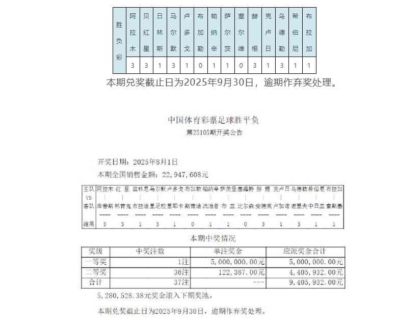 北京时间8月1日,胜负彩第25105期开奖结果揭晓。本期14场一等奖开出1注500万,528万滚存至8月2日晚停售的第25106期竞猜。14场二等开出36注,单注奖金12.2万余元;任九开出287注,单注奖金3.1万余元。本期胜负彩销量为22,947,608元,任九投注总额为14,007,904元。