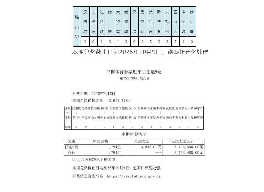 北京时间8月5日,胜负彩第25107期任九开奖结果揭晓。本期头奖爆出1,794注,单注奖金4,852元,本期任九投注总额为13,602,718元。