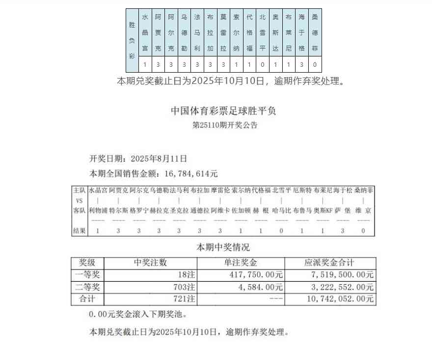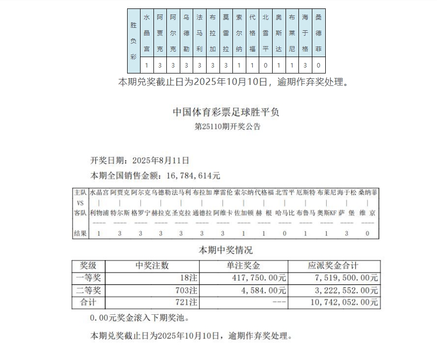 北京时间8月11日,足彩第25110期开奖结果揭晓。本期头奖开出18注,单注奖金417,750元;二等奖开出703注,单注奖金4584元。任九开出6195注,单注奖金1530元。本期足彩销量为16,784,614元,任九投注总额为14,816,584元。