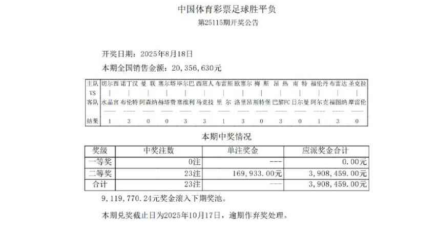 北京时间8月18日,足彩第25115期开奖结果揭晓。本期14场1等空开,911万滚存至第25116期竞猜。14场2等开出23注16.9万;任九开出177注70049元。本期足彩销量为20,356,630元,任九投注总额为19,373,056元。
