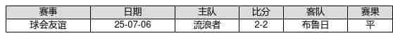 流浪者 VS 布鲁日两队近10年的交战次数为1场,流浪者0胜1平0负,赢球概率为0.0%,平局概率为100.0%,输球概率为0.0%。