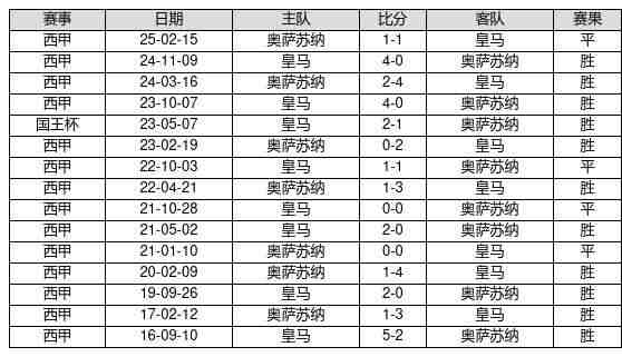 皇马 VS 奥萨苏纳两队近10年的交战次数为15场,皇马11胜4平0负,赢球概率为73.3%,平局概率为26.7%,输球概率为0.0%。
