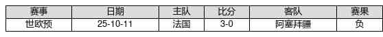阿塞拜疆 VS 法国两队近10年的交战次数为1场,阿塞拜疆0胜0平1负,赢球概率为0.0%,平局概率为0.0%,输球概率为100.0%。