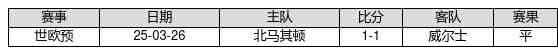 威尔士 VS 北马其顿两队近10年的交战次数为1场,威尔士0胜1平0负,赢球概率为0.0%,平局概率为100.0%,输球概率为0.0%。