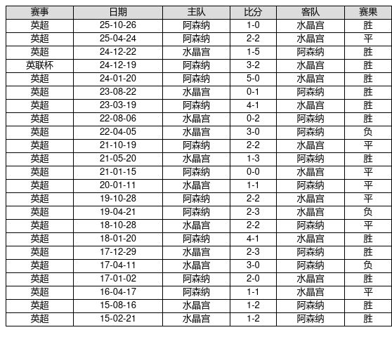 阿森纳 VS 水晶宫两队近10年的交战次数为23场,阿森纳13胜7平3负,赢球概率为56.5%,平局概率为30.4%,输球概率为13.0%。