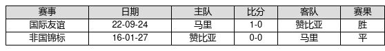 马里 VS 赞比亚两队近10年的交战次数为2场,马里1胜1平0负,赢球概率为50.0%,平局概率为50.0%,输球概率为0.0%。