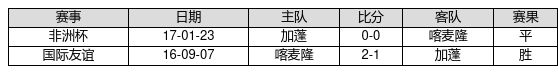 喀麦隆 VS 加蓬两队近10年的交战次数为2场,喀麦隆1胜1平0负,赢球概率为50.0%,平局概率为50.0%,输球概率为0.0%。