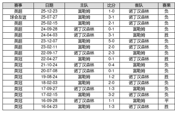 诺丁汉森林 VS 富勒姆两队近10年的交战次数为17场,诺丁汉森林4胜1平12负,赢球概率为23.5%,平局概率为5.9%,输球概率为70.6%。