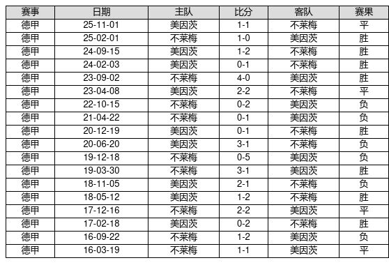 不莱梅 VS 美因茨两队近10年的交战次数为18场,不莱梅8胜4平6负,赢球概率为44.4%,平局概率为22.2%,输球概率为33.3%。