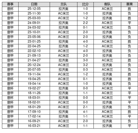 拉齐奥 VS AC米兰两队近10年的交战次数为26场,拉齐奥7胜7平12负,赢球概率为26.9%,平局概率为26.9%,输球概率为46.2%。