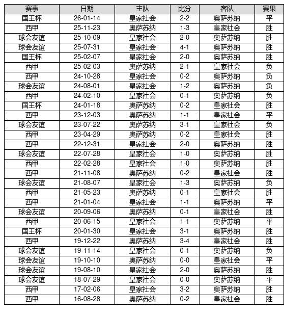 皇家社会 VS 奥萨苏纳两队近10年的交战次数为30场,皇家社会17胜6平7负,赢球概率为56.7%,平局概率为20.0%,输球概率为23.3%。