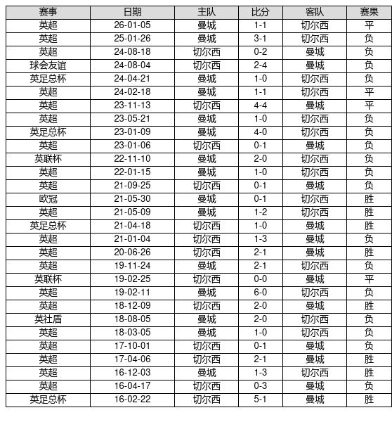 切尔西 VS 曼城两队近10年的交战次数为29场,切尔西8胜4平17负,赢球概率为27.6%,平局概率为13.8%,输球概率为58.6%。