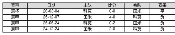 科莫 VS 国米两队近10年的交战次数为4场,科莫0胜1平3负,赢球概率为0.0%,平局概率为25.0%,输球概率为75.0%。
