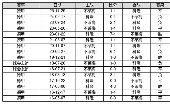 科隆 VS 不莱梅两队近10年的交战次数为16场,科隆3胜8平5负,赢球概率为18.8%,平局概率为50.0%,输球概率为31.2%。