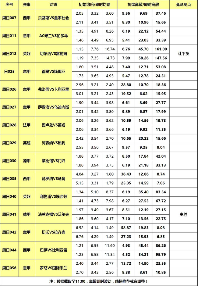 [关于离散] 是竞技彩票特有分析指数,指数基于百家欧赔即时赔率分歧度。基本原理是:百家欧赔平均值与每家赔率差值的绝对值的求和。离散度小则赔率公司观点接近,进而 彩果易打出,离散度大则反之意见分歧大,彩果不易打出。又因**操盘/变赔影响,离散低则概率高理论并非放之四海而皆准,需结合盘赔和基本面等信息综合运 用。简言之,离散是参考指标,而非填单依据!以下是各场数据汇总(数据截取至11:00):