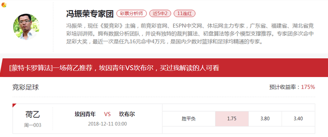 竞彩官方开出1.75 3.80 3.40的初始奖金指数,从目前来看,官方对主队的支持率更大一些。埃因霍温青年队本赛季一如既往的表现出色,而坎布尔新赛季高开低走,蒙特卡罗算法支持主队大胜轻取三分。