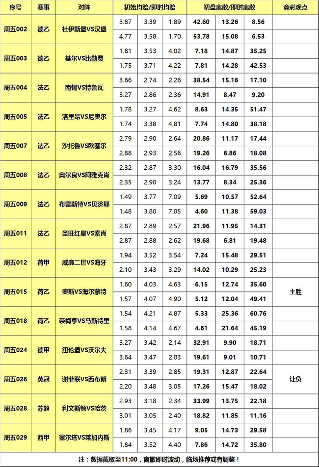周五回归联赛模式,今晚依然主打法系和荷系赛事,上轮法系赛事多数延期,本轮比赛基本照常进行。另外德乙继续2场早场,领头羊汉堡将率先登场。五大联赛方面,今晚德甲、西甲和法甲分别1场周五夜场。周五赛程共计30场,早间档精选分享15场联赛指数,另附荷乙和英冠2场早场解读!晚间分享精选15场晚场离散,另附竞彩/指数观点,主推3场和2单串关,欢迎搜索关注“竞足离散”专家号获取!