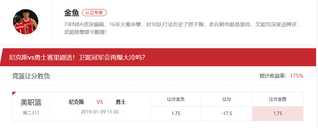 [新浪球通]金鱼篮彩推荐:尼克斯vs勇士
