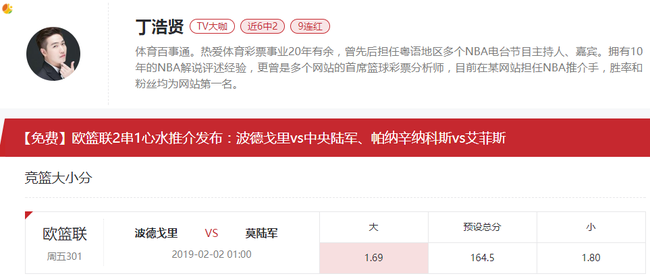 [新浪球通]丁浩贤竞彩篮球推荐:波德戈里VS莫陆军