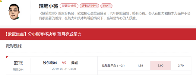 初时指数给出曼城让1/1.5球高水,后势指数升至1.5/2球高水,对曼城的支持力度陡然加大。值得一提的是,曼城将在4天之后将在联赛杯决赛中遭遇切尔西,球队必定会分心,而且又是热门方,因此看好球队至多赢两球,推荐沙尔克+2球胜、平。